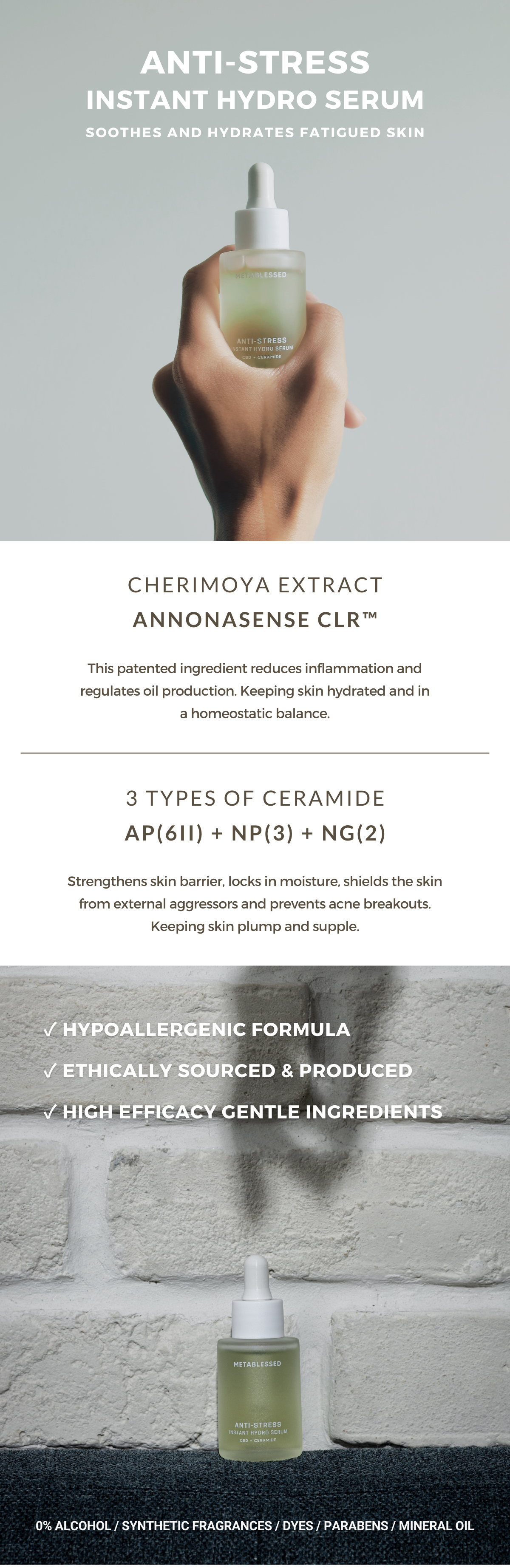 It is probably a result of lifestyle-induced stress or they’re adapting to seasonal changes. Our Anti-Stress Serum assists your skin cells in emotional regulation. It calms reactive skin, reduces inflammation, and helps your skin restore its peace and balance with its gentle formula: