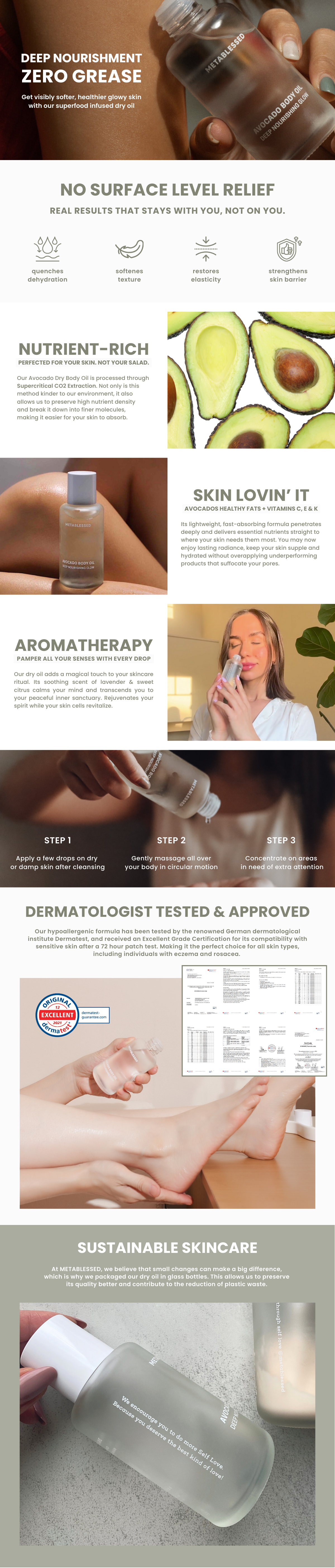 Our Avocado Dry Oil glides onto your skin effortlessly with its fast-absorbing formula, providing long-lasting hydration without leaving any greasy residues.